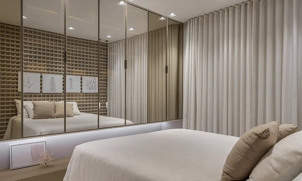 Nos dormitórios e closets, a personalização interna traduz essa mesma inteligência. Gavetas com divisórias específicas, módulos ajustados à altura de cabides longos, compartimentos dedicados a acessórios e iluminação embutida acionada automaticamente tornam o uso intuitivo. O móvel planejado deixa de ser apenas estrutura de armazenamento e passa a funcionar como extensão da rotina, antecipando necessidades e reduzindo esforço.
